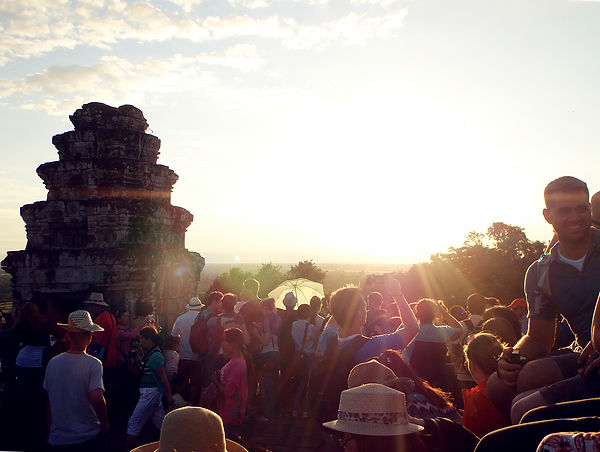 吳哥窟區內看夕下最盛的點是South Gate 的Wat Phnom. 這司機真的想騙我錢,本來都是包在裡面的路錢,現在竟然要我 加錢才可以去看夕下,太過份了!塔上,5:30pm,中國旅客好多好多,多到照片裡不只有甲乙丙丁,還有戊己艮辛壬癸!那晚上,我約了Dr. Sovet. 他行醫兩年,有了個牙科診所,他載我兜城外看風景,直到2:30am 才回來,風越夜就越冷,手放在漆蓋上也無法僻寒。