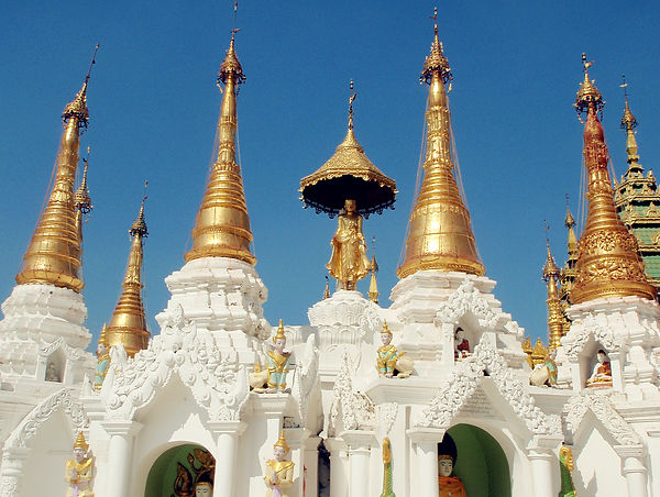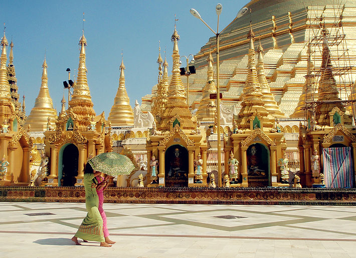 第二站,Shwedagon Pagoda,是緬甸最神聖的大廟。據說,佛陀在公元103年悟道後,在城門遇到兩位緬甸商人-Taphussa 與Ballika。他們供佛以食,佛則取下他的7根頭髪為回禮。兩位商人回到緬甸後,便把佛陀的頭髪贈送給當時的國王-King Okkalapa。Okkalapa 王便分咐造金舍大廟以敬這如此尊貴的信物。從古至今,這Shwedagon 大廟的建設經歷了32個皇室的傳承。