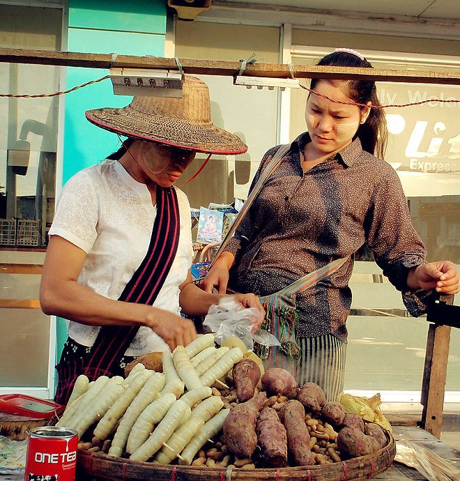 人窮要有志氣,要懂得惜緣感恩。窮一世人,來世不要再窮。因為這樣,一路上都遇到心心念念要做善人的人,走完Shwedagon Pagoda,踏盡遍地大理石,付不起另外一個8000Kyats的德士費,通過一串緬文,來到寺廟的北大門出口,一位尼姑,一位男士Taw Win,這巧遇順利地把我們送到Aung Mingalar 車站。一站皆一站的巴士穿行,路上遇到這樣好心的人,恰似唐僧取經隨處結緣。Taw Win 是好心人,上了巴士還想幫我們給車費,又想給我東西做禮物,轉了兩趟巴士,最後來到Aung Mingalar又不見Elite 辦公室,他也安排機車載我們進去,要是沒有他的熱心,我們會去到哪裡?要是半途他提早下車,我們接下來會遇到何種狀况?一個沙巴鑰匙圈送給他尼姑,另一個給了Taw Win,面子書加了以後好聯系。Aung Mingalar 是仰光大車站,是所有遠途巴士必停之地,我們當天就要撘大巴前往妮姐的城鎮Monywa,出發前吃些薯類充飢吧。